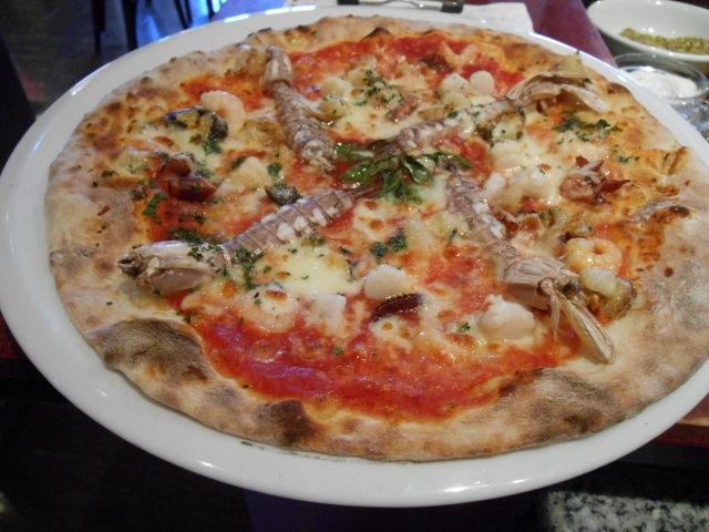 魚介を使った前菜、石釜で焼いた魚介のピッツァ、魚介を使ったパスタ