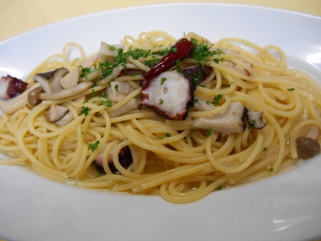 ●地タコといろいろきのこのガーリックソーススパゲッティ(通年) 1,300円 尾道の地タコをイタリアナポリ直伝の調理法で召し上がって頂きます。タコの旨味を最大限に生かしたパスタをぜひどうぞ。