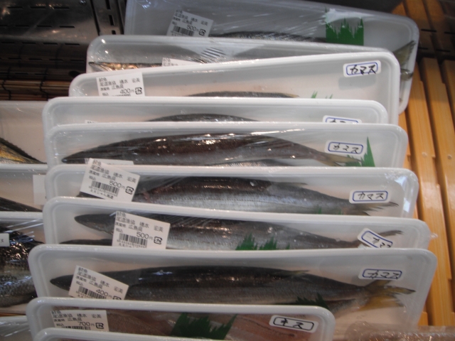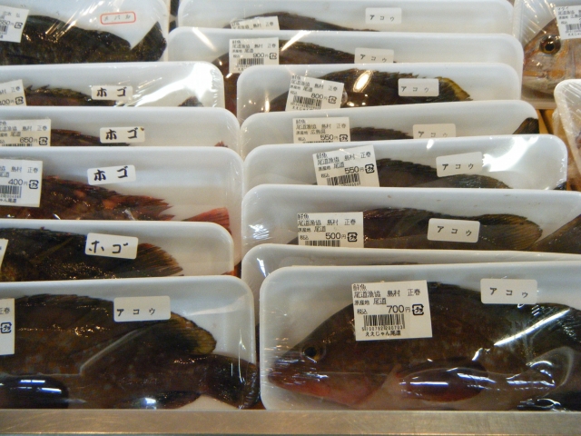 刺身やアラなども多数陳列されており、アコウのアラは煮立たせず、ゆっくり煮てソーメンつゆにすれば美味しいよ、と出荷者の話でした。贅沢なつゆですね。